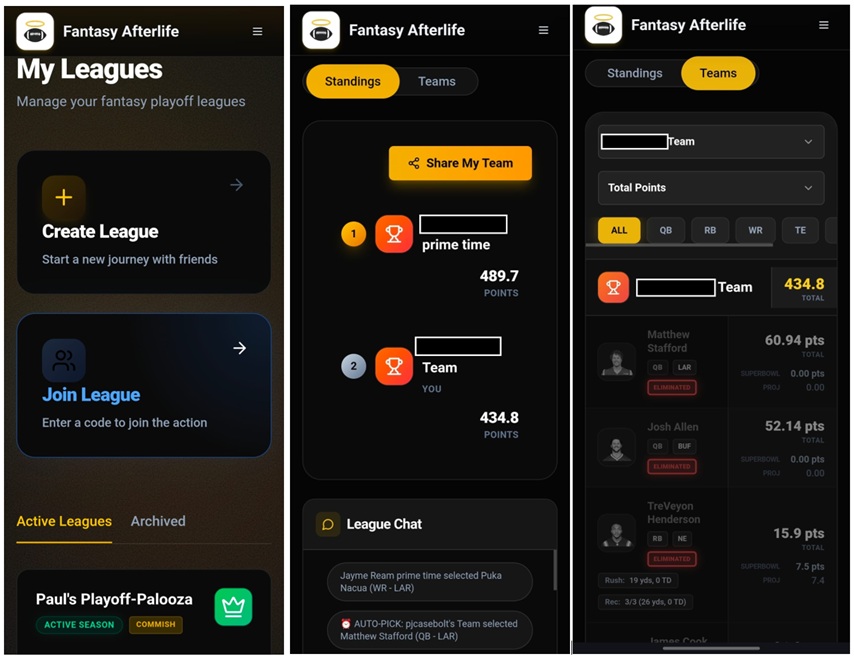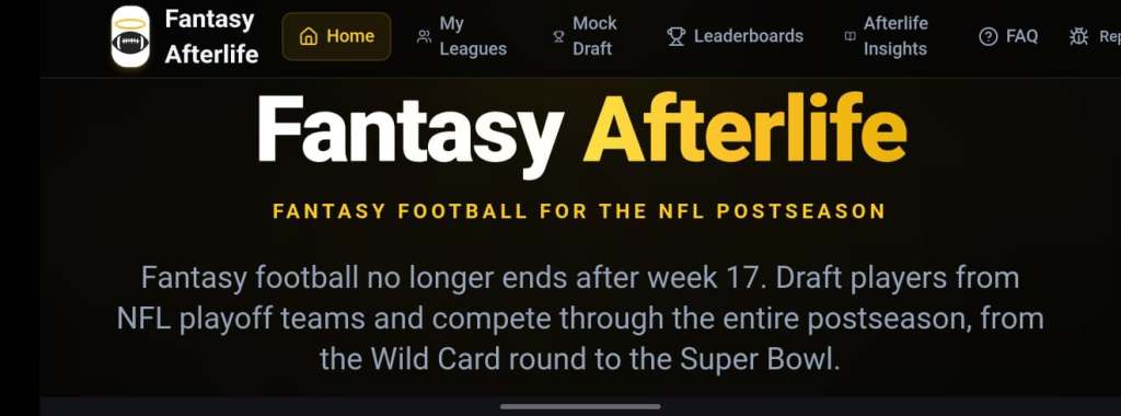 I enjoy fantasy football. I also hate it (sometimes) – but mostly I enjoy it. When the season comes to an end, it’s always a little bit sad. We used to have a former team member at my work who would do a “post-season fantasy” competition every year on paper. He left for a new opportunity this year, so I had resigned myself to the fact that this year’s fantasy season would be over after week 17. Then, my Instagram algorithm happened, and I discovered Fantasy Afterlife. Focusing solely on post-season football, the platform provides that opportunity for us true fantasy football sickos to have one more shot at a championship (just in case four in a single season wasn’t enough).